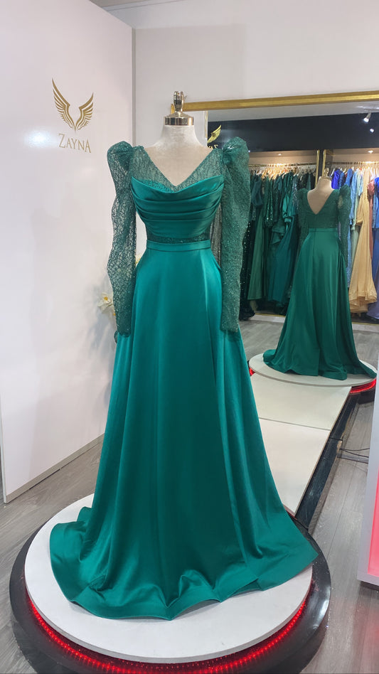 A Line Champagne V Neck Crystal Tulle Prom Dress With 3 4 Sleeves
